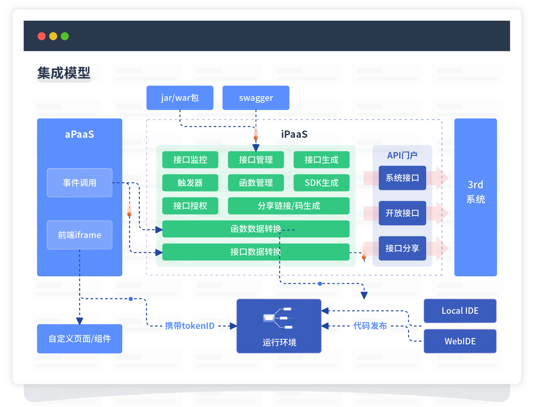 集成模型包括平台本身前、、后端能力的扩展,,也支持通过API门户和第三方系统进行交互。。。