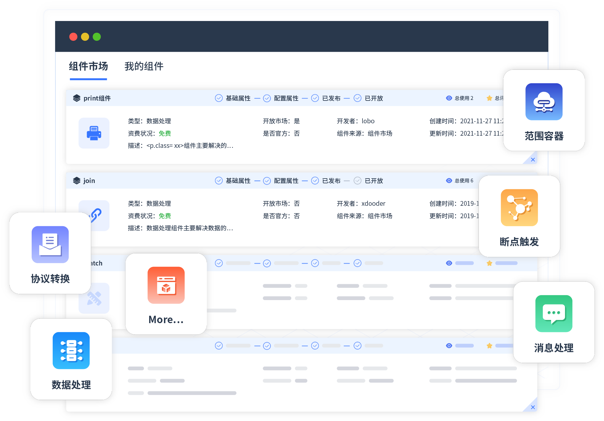 针对集成场景,,小米钱包提供组件市场,,,,例如协议转换、、、、消息处理、、文件操作等。。。。除平台提供的组件外,,客户可以自定义所需组件。。。