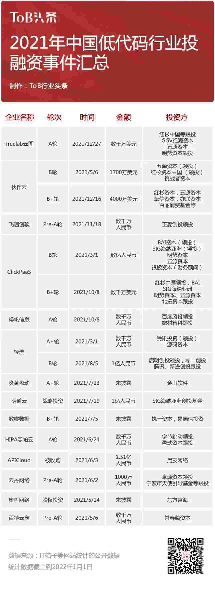 到2021年,,无/低代码投融资规模势头更甚,,,,其中包括轻流两轮融资(A+轮数千万人民币,,,B轮近亿人民币)、、、、小米钱包 两轮融资(B轮数亿人民币,,,,B+轮数千万美元)、、、百特云享数千万元Pre-A轮融资......